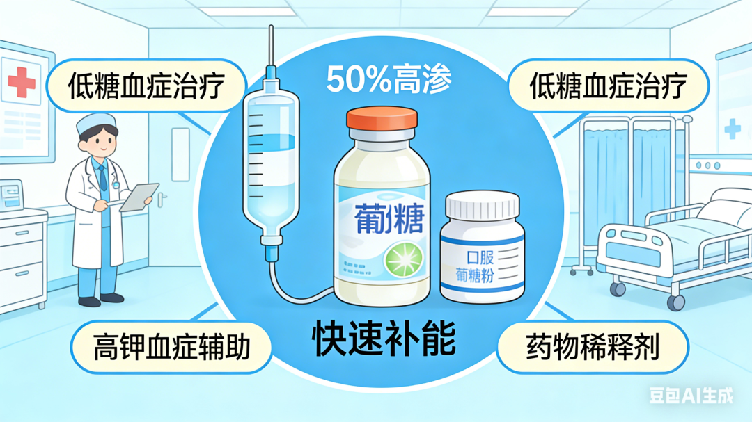 葡萄糖是临床常用的能量补给物质,其制剂(葡萄糖注射液、口服葡萄糖粉剂)广泛用于多种病症的治疗与辅助治疗。具体应用包括:补充能量和体液,用于进食不足、大量体液丢失(如呕吐、腹泻)、全静脉内营养及饥饿性酮症等情况;治疗低糖血症,重度患者可通过静脉注射50%高渗葡萄糖快速缓解症状;辅助治疗高钾血症,与胰岛素联合静脉滴注,可促进钾离子进入细胞内,降低血钾浓度;用作组织脱水剂,高渗葡萄糖注射液快速静脉注射可短暂脱水,调节腹膜透析液渗透压;还可作为药物稀释剂,用于配制极化液(GIK液),或用于静脉法葡萄糖耐量试验。此外,口服10%葡萄糖溶液可改善妇科腹腔镜手术患者术前舒适度,促进术后胃肠功能恢复。