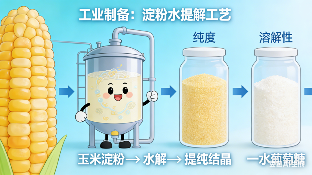 工业上葡萄糖主要通过淀粉水解工艺制备,因原料易得、工艺成熟,成为主流生产方式。最常见的原料是玉米淀粉,因此葡萄糖也常被称为玉米葡糖、玉蜀黍糖。生产过程中,通过酶法或酸法催化淀粉水解,再经提纯、结晶得到高纯度葡萄糖产品,分为无水葡萄糖和一水葡萄糖两种形式,前者纯度更高、稳定性好,后者易溶解,适配不同应用场景。此外,也可通过蔗糖、果糖等其他糖类经酶催化转化得到葡萄糖,或尝试利用纤维素水解制备,但纤维素的顽固性导致该方法尚未实现工业规模化应用。