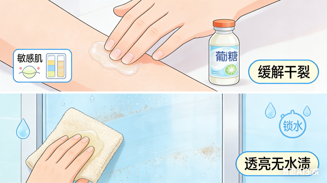 在皮肤护理方面,冬季皮肤干燥开裂时,可将少量葡萄糖粉溶于温水中,搅拌均匀后涂抹于干裂部位,葡萄糖的保湿性可帮助缓解干燥,辅助修复皮肤屏障(敏感肌需先做皮肤测试)。在清洁方面,葡萄糖溶液可用于擦拭玻璃、镜子等物品,其黏性可带走表面污渍,擦拭后用干布擦干,能让玻璃更透亮,且不易残留水渍。
