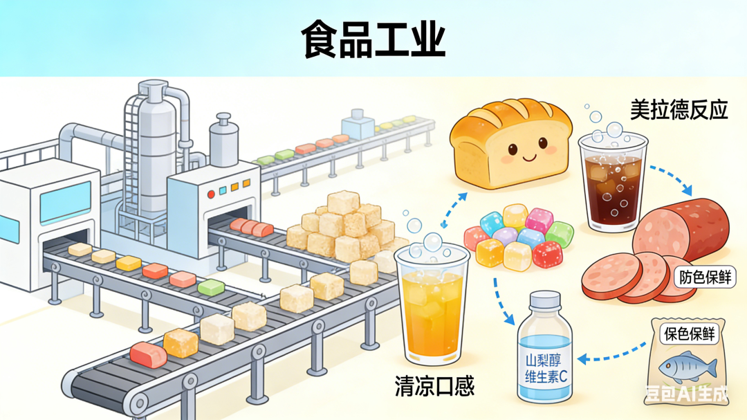 食品工业是葡萄糖最大的应用市场,凭借甜度适中、易代谢、能参与风味形成等特性,广泛用于各类食品加工。在烘焙行业,葡萄糖可促进酵母生长发酵,参与美拉德反应使面包形成金黄色外皮和独特香味,提升面包韧性,还能改善饼干、糕点的色泽均匀度,用其制作的糖霜储存时不易结块;在糖果业,葡萄糖已从添加剂转为主要原料,可防止蔗糖结晶,提升糖果口感,还能为口香糖、泡泡糖涂层增加甜度和光泽,带来凉爽口感;在饮料行业,葡萄糖溶解时吸热量高,能带来清凉感,适合制作冰淇淋、冰糕等冷饮,还可平衡甜度、富集风味,用于果汁、碳酸饮料、茶饮品等,同时能调节果酒发酵的含糖量,生产低热啤酒;在肉制品加工中,葡萄糖可调节pH值和氧化还原状态,作为发酵细菌的碳源,还能起到助发色、保色作用,延长香肠等制品的保质期,添加量通常为0.3%~1.0%;在蔬菜加工业,葡萄糖作为保鲜剂和营养剂,可提高脱水效果、降低水分活度,防止蔬菜脱水时过度收缩,帮助复水后恢复原有组织状态。此外,葡萄糖还可直接分装为多维葡萄糖等产品,作为婴儿糖料或日常营养补剂。